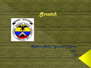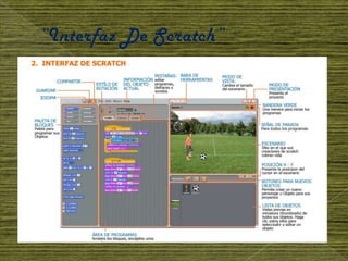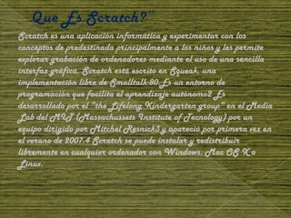 Scratch es una aplicación educativa desarrollada por el MIT para que los niños aprendan conceptos de programación de una manera sencilla e interactiva mediante bloques visuales. Los proyectos en Scratch se componen de objetos con diferentes disfraces que pueden interactuar en el escenario. Existen tres tipos de bloques (apilables, sombreros y reporteros) para programar el comportamiento y acción de los objetos.
