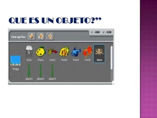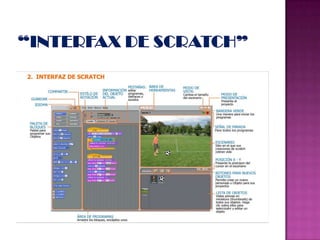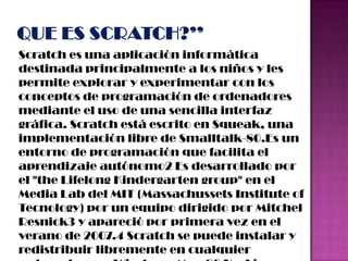 Scratch es una aplicación educativa gratuita desarrollada por el MIT para enseñar conceptos básicos de programación a niños de manera divertida y visual. Los proyectos en Scratch se componen de objetos con diferentes disfraces que pueden moverse y interactuar en el escenario. Existen bloques de comandos para controlar el comportamiento de los objetos y crear historias, juegos y animaciones.