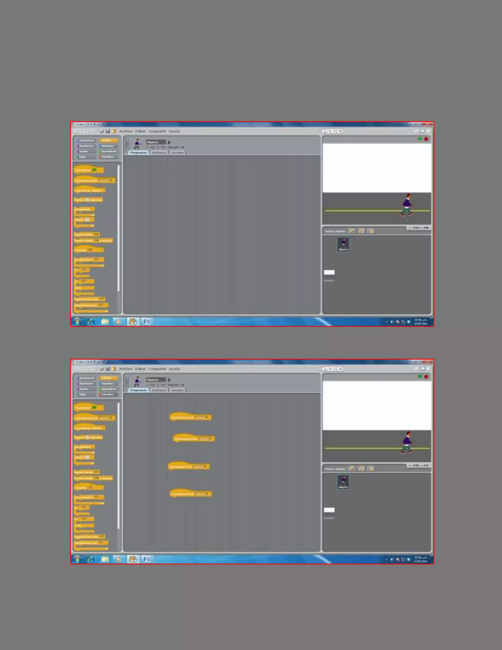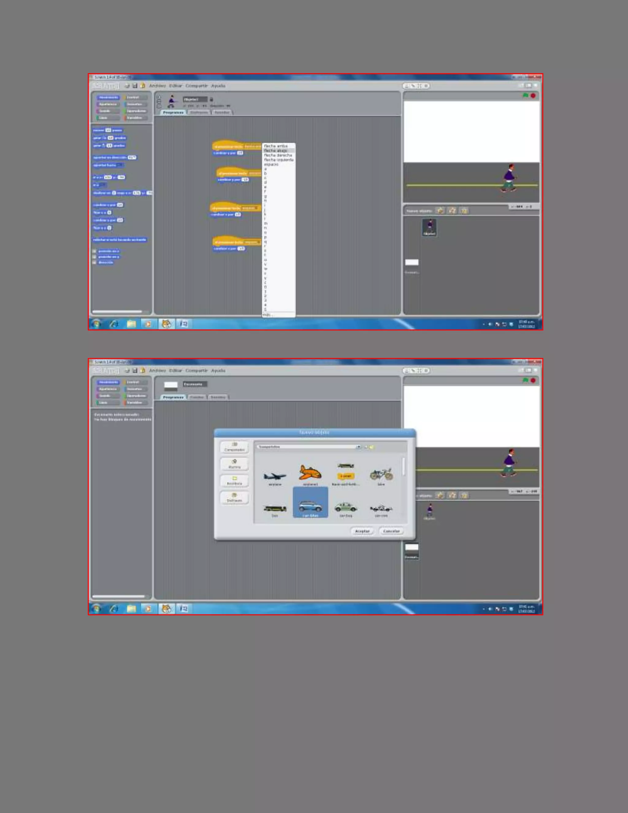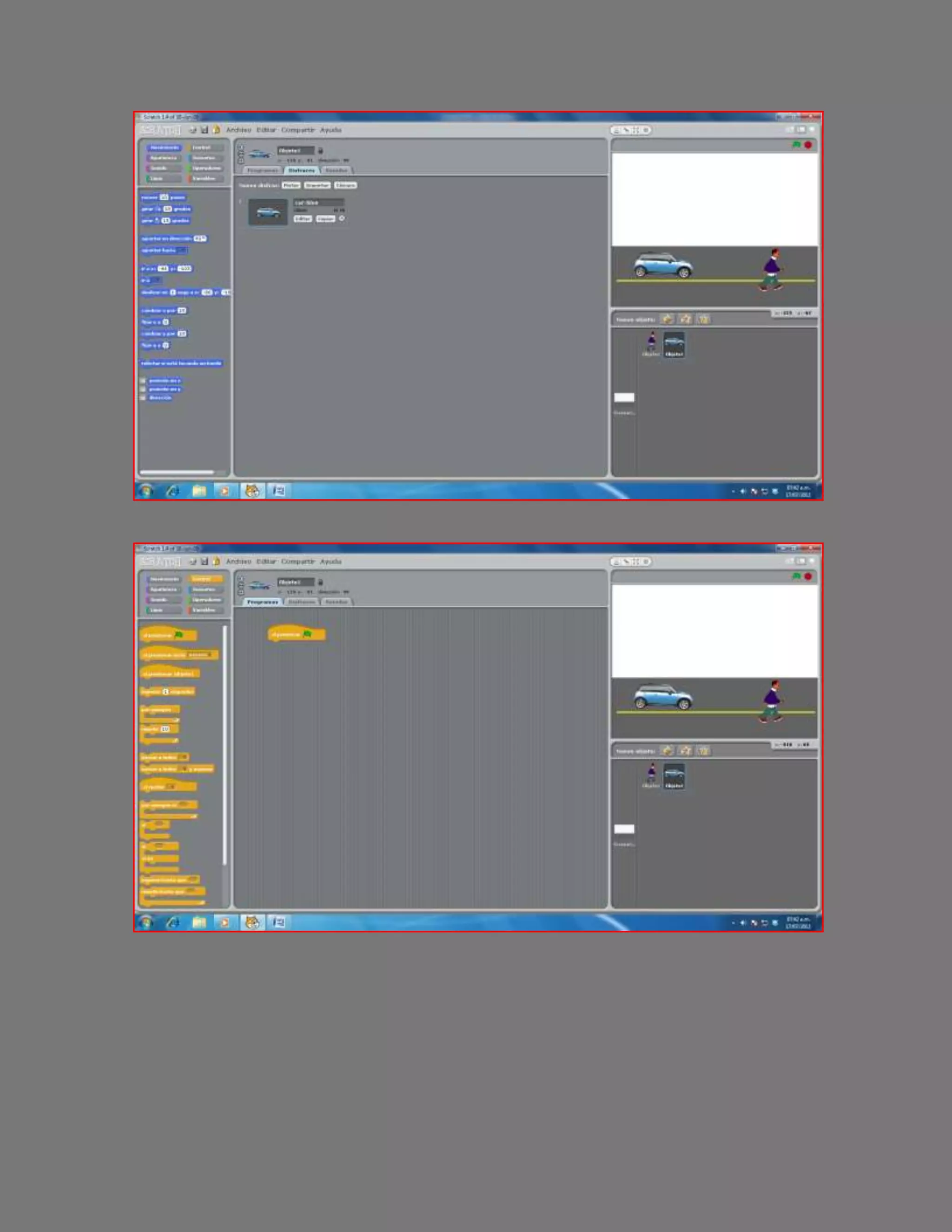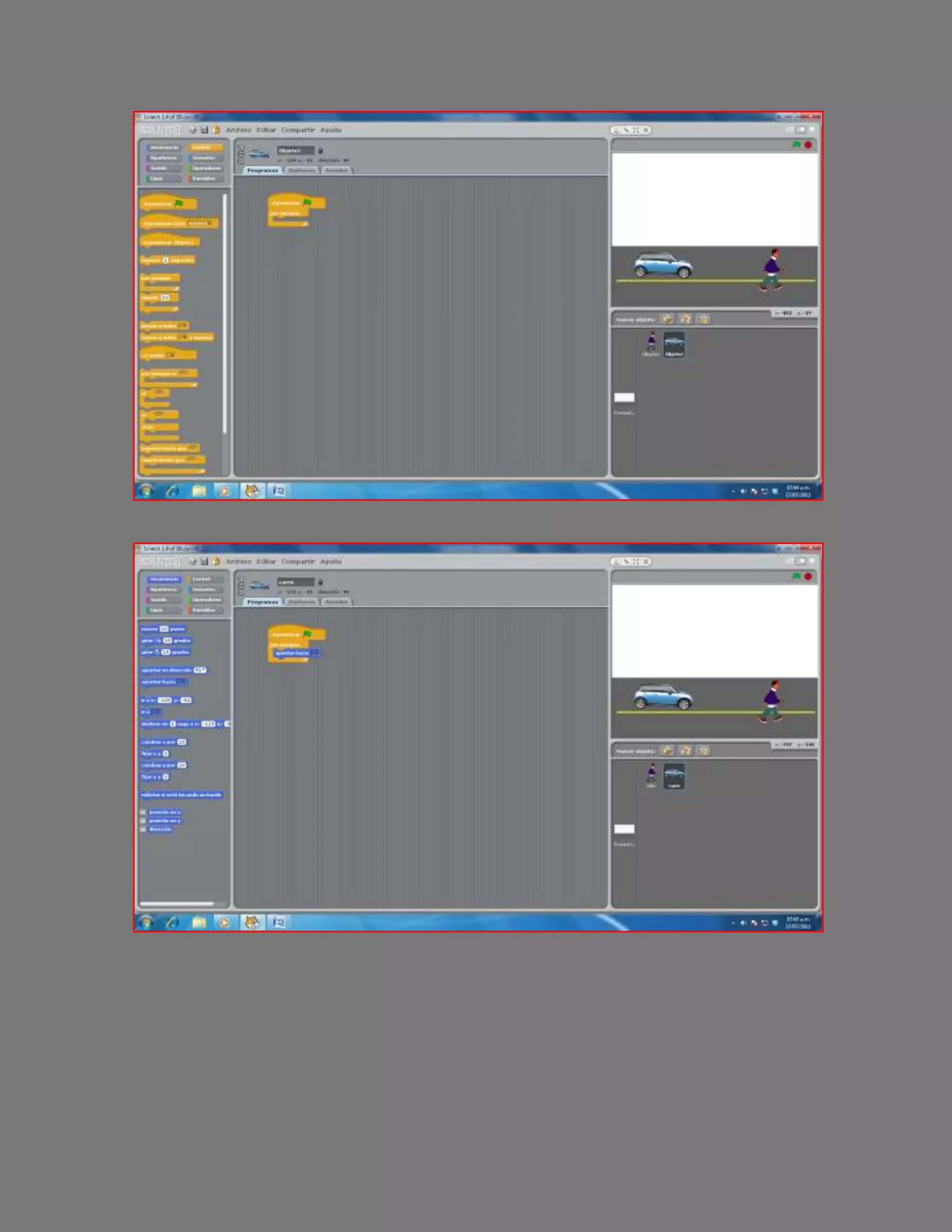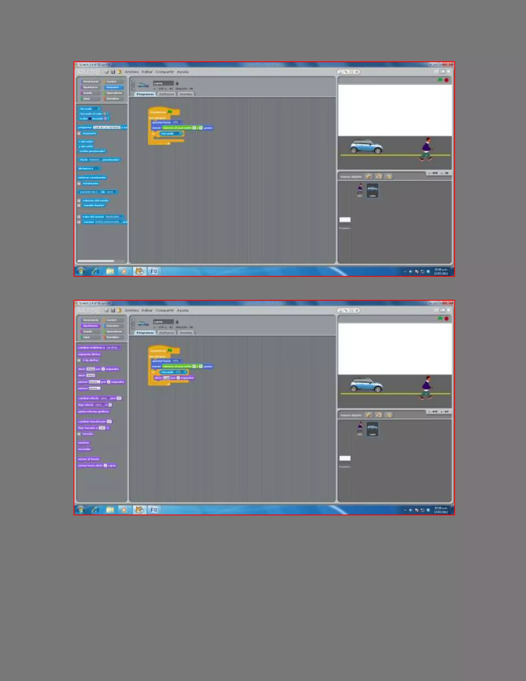 El documento presenta un proyecto de juego en Scratch 1.4 que programa un carro para que siempre apunte y se mueva hacia un niño de 1 a 3 pasos cuando se presione, y diga "lucer" cuando toque al niño.