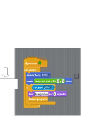 El documento presenta un proyecto de programación Scratch sobre un gato animado que puede moverse usando las flechas del teclado. El proyecto incluye el escenario de fondo y la programación para que el gato responda a los comandos de las flechas para moverse.