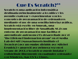 Scratch es una aplicación educativa desarrollada por el MIT para enseñar conceptos básicos de programación a niños de manera divertida y visual. Los usuarios pueden crear historias, juegos y animaciones mediante bloques de programación que controlan objetos con diferentes disfraces en un escenario. Los proyectos de Scratch se componen de objetos, escenarios, bloques de programación y disfraces.