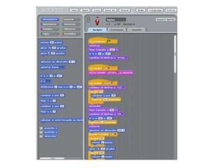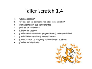 El documento proporciona una introducción a Scratch, incluyendo: 1) qué es Scratch y sus componentes básicos como proyectos, objetos y bloques de programación; 2) los componentes de la interfaz como escenarios, objetos y disfraces; y 3) formatos compatibles de imágenes y sonidos y qué es un algoritmo.