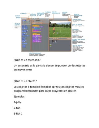 Scratch es una herramienta de programación que permite crear historias, juegos y animaciones de forma sencilla. Los proyectos en Scratch consisten en objetos o sprites con disfraces que pueden moverse y reaccionar según bloques de programación unidos en scripts. Los escenarios son las pantallas donde se ven los objetos en movimiento.