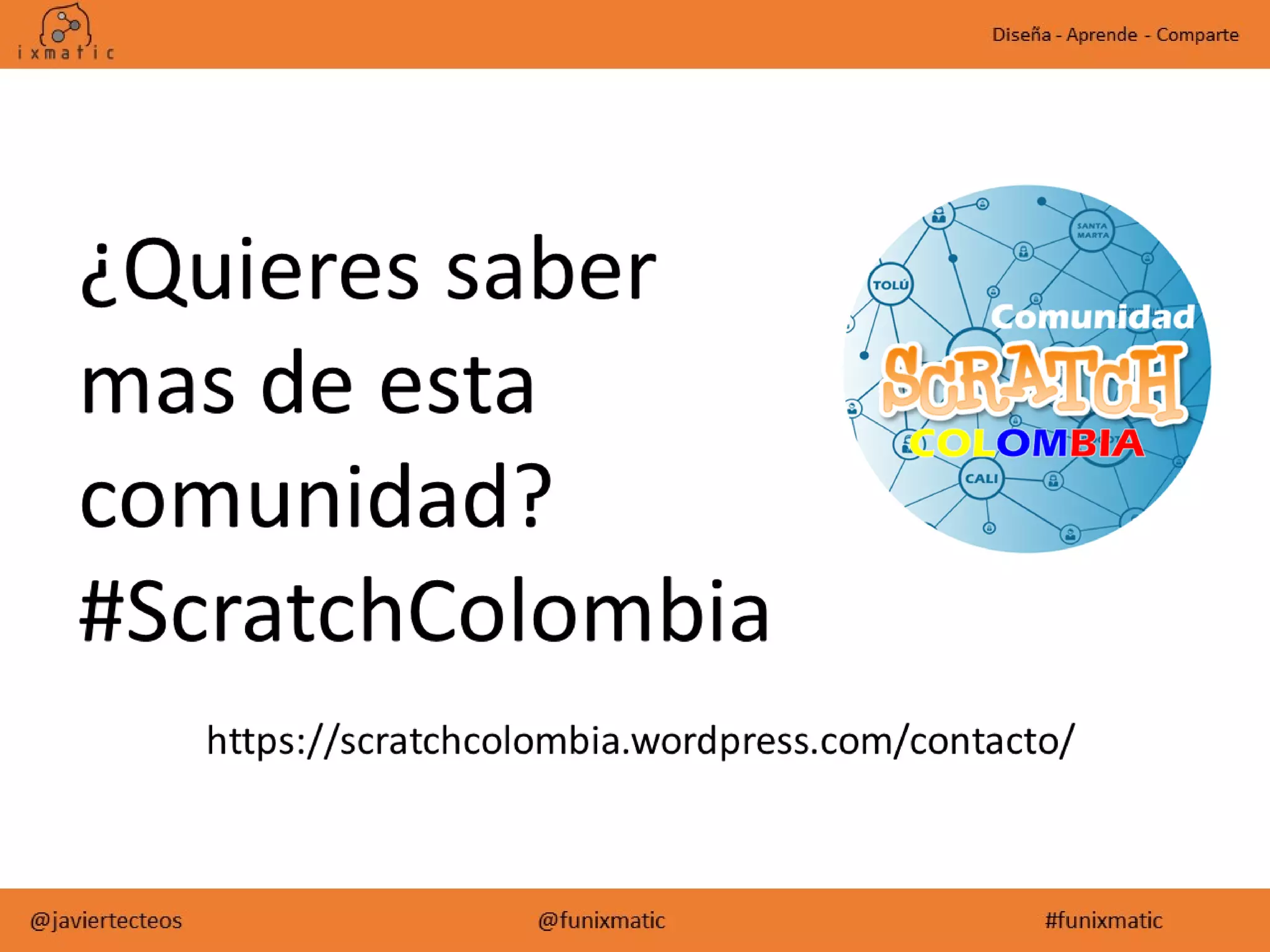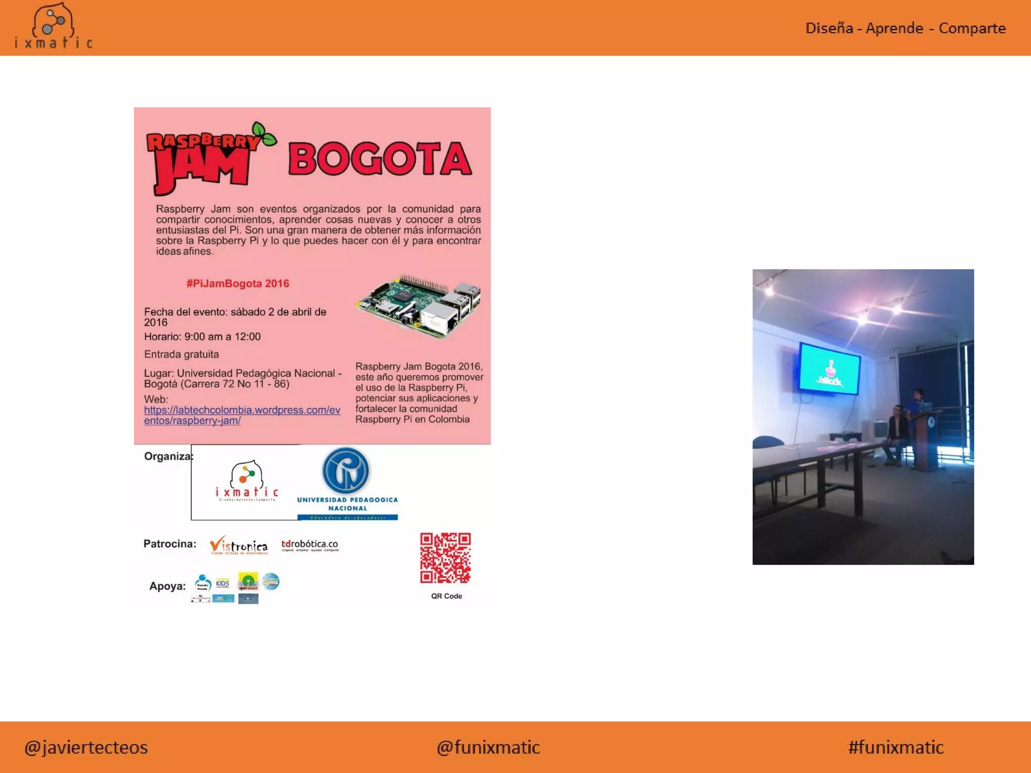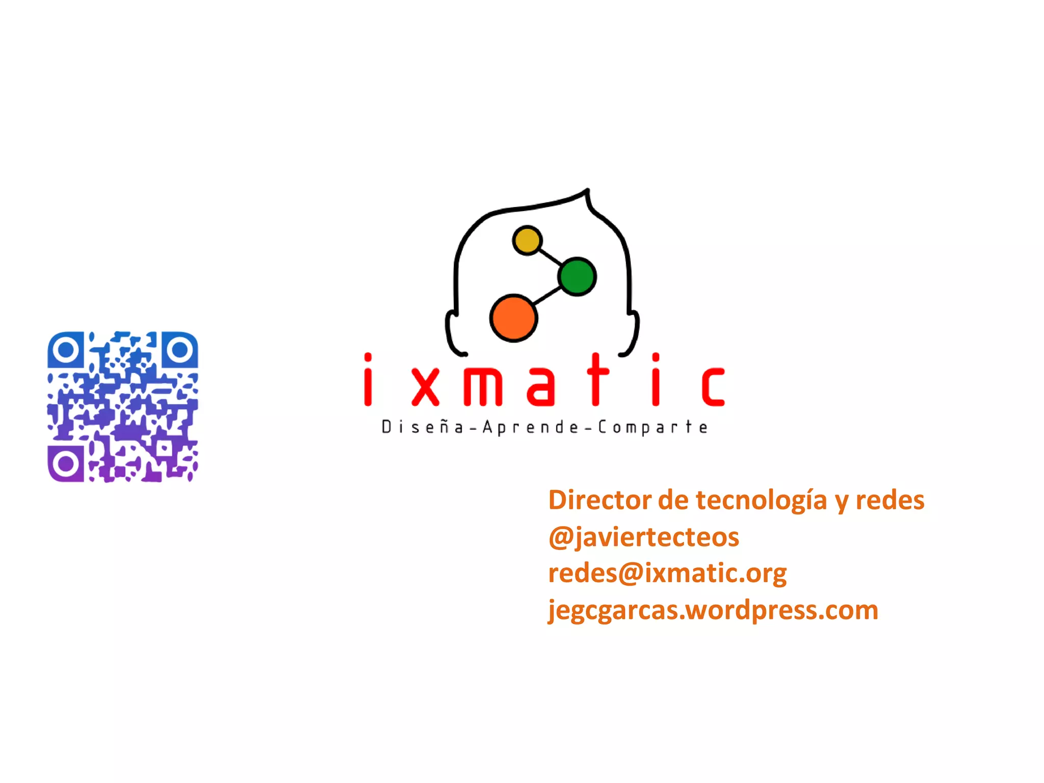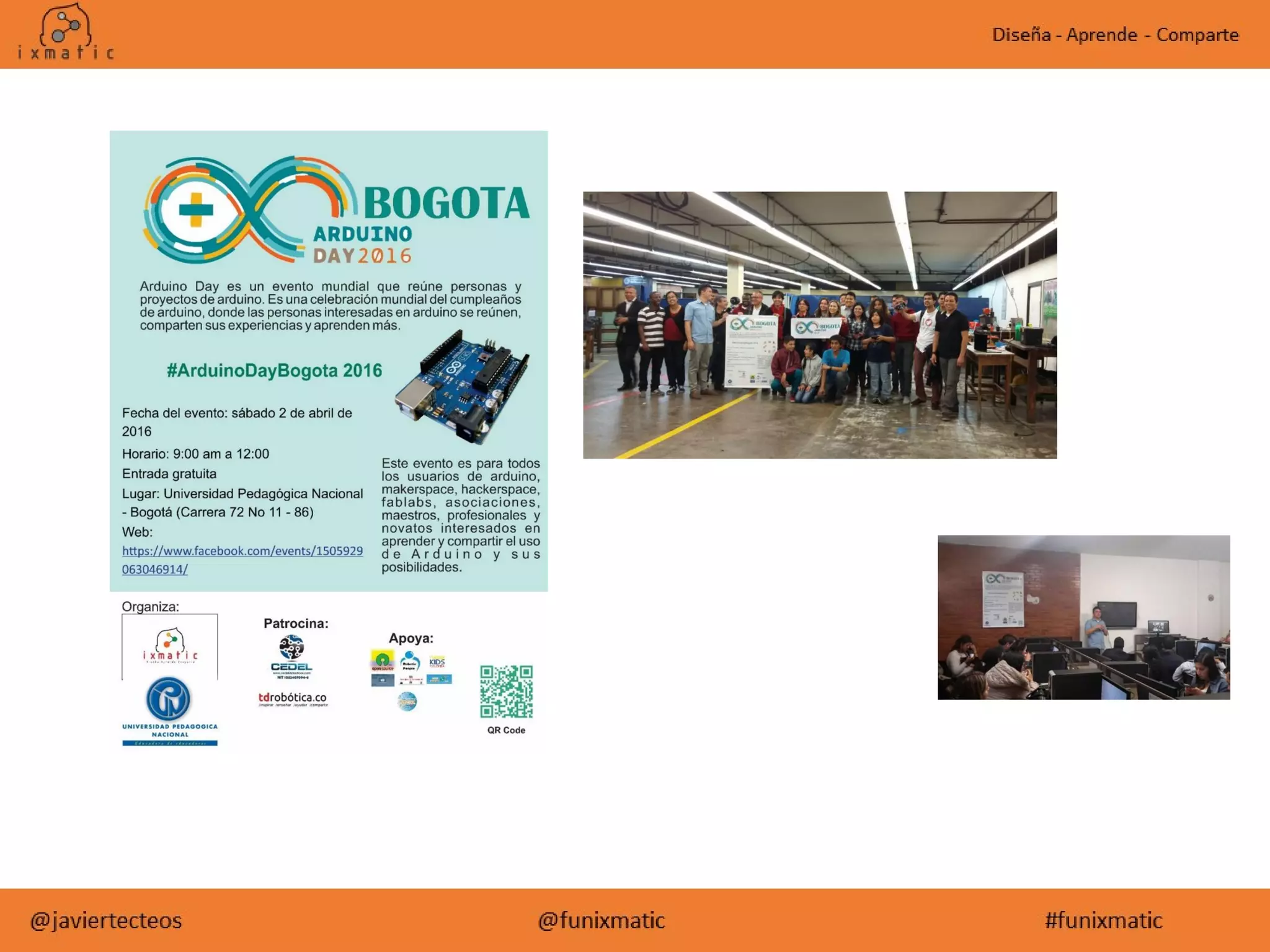 Este documento presenta la información de contacto de Javier García, director de tecnología y redes. Describe los cursos y eventos que ofrece relacionados con robótica, programación, impresión 3D y más. También menciona varias comunidades y recursos en línea relacionados con la ciencia, tecnología y programación para niños en Colombia.