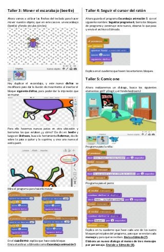 El documento detalla un taller educativo sobre el uso del programa Scratch para enseñar programación y desarrollo del pensamiento lógico a los estudiantes. Se presentan diferentes actividades y pasos para crear programas, incluyendo animaciones y diálogos utilizando objetos gráficos. Al finalizar, los estudiantes deben enviar sus proyectos a Edmodo para evaluación.