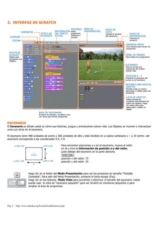 Este documento proporciona una guía de referencia para el programa de programación visual Scratch. Explica los componentes básicos de un proyecto de Scratch como objetos, escenario y bloques de programación. También describe la interfaz de usuario de Scratch incluyendo la paleta de bloques, área de programas, disfraces, sonidos y otras herramientas.