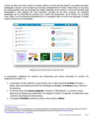 Este documento presenta una guía de referencia de Scratch 2.0, la nueva versión de la herramienta de programación que funciona completamente en línea. Describe los principales cambios de Scratch 2.0 con respecto a la versión 1.4, incluyendo la capacidad de crear y editar proyectos en línea sin necesidad de descargar el programa. Además, explica los elementos básicos para crear proyectos en Scratch como objetos, disfraces, escenarios y programas mediante bloques de comandos. Finalmente, presenta una