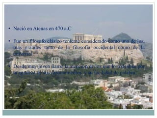 Sócrates fue un filósofo griego de la antigua Atenas que vivió entre los años 470-399 a.C. Desarrolló un método dialéctico de preguntas y respuestas para estimular la reflexión crítica y llegar a la verdad. Creía que el único conocimiento verdadero era saber que no se sabe nada. Fue condenado a muerte por corromper a la juventud, pero inspiró a varios discípulos como Platón a fundar escuelas filosóficas.