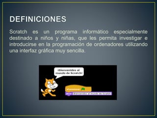 Scratch es un programa educativo de programación para niños desarrollado por el MIT. Utiliza bloques de programación gráficos para crear historias interactivas con sonidos e imágenes. Se inspiró en Logo y e-toys y tiene como objetivo introducir conceptos básicos de programación de una manera divertida y fácil de usar.