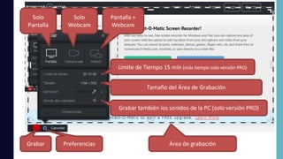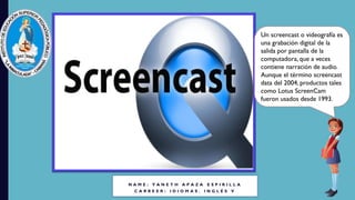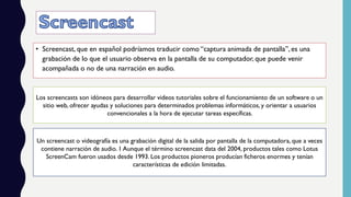 Un screencast es una grabación digital de la pantalla de una computadora, a menudo con narración en audio, utilizada para crear tutoriales y ofrecer soluciones informáticas. Aunque el término se popularizó en 2004, herramientas anteriores como Lotus Screencam existen desde 1993. El documento también proporciona instrucciones sobre la instalación y grabación usando Screencast-O-Matic, incluyendo opciones de exportación del video.