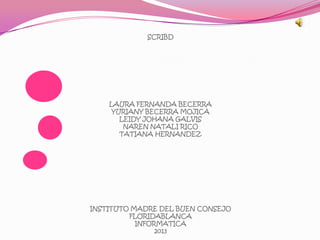 Este documento presenta información sobre Scribd, una plataforma para compartir documentos en línea de forma gratuita. Menciona que permite subir y alojar documentos en diferentes formatos como PDF, Word y PowerPoint, y proporciona códigos para insertarlos en páginas web. También resume brevemente la historia de la creación de Scribd y algunas de sus ventajas como la facilidad de acceso a documentos de forma online.