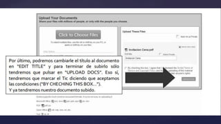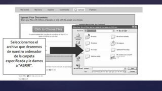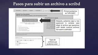 Este documento explica qué es Scribd, una red social para publicar y compartir documentos de texto en varios formatos. Los usuarios pueden subir documentos ilimitados, seguir a otros usuarios, agregar documentos a listas de lectura, descargar documentos para leer sin conexión, y comentar y calificar documentos. Scribd también permite compartir documentos en otras redes sociales.