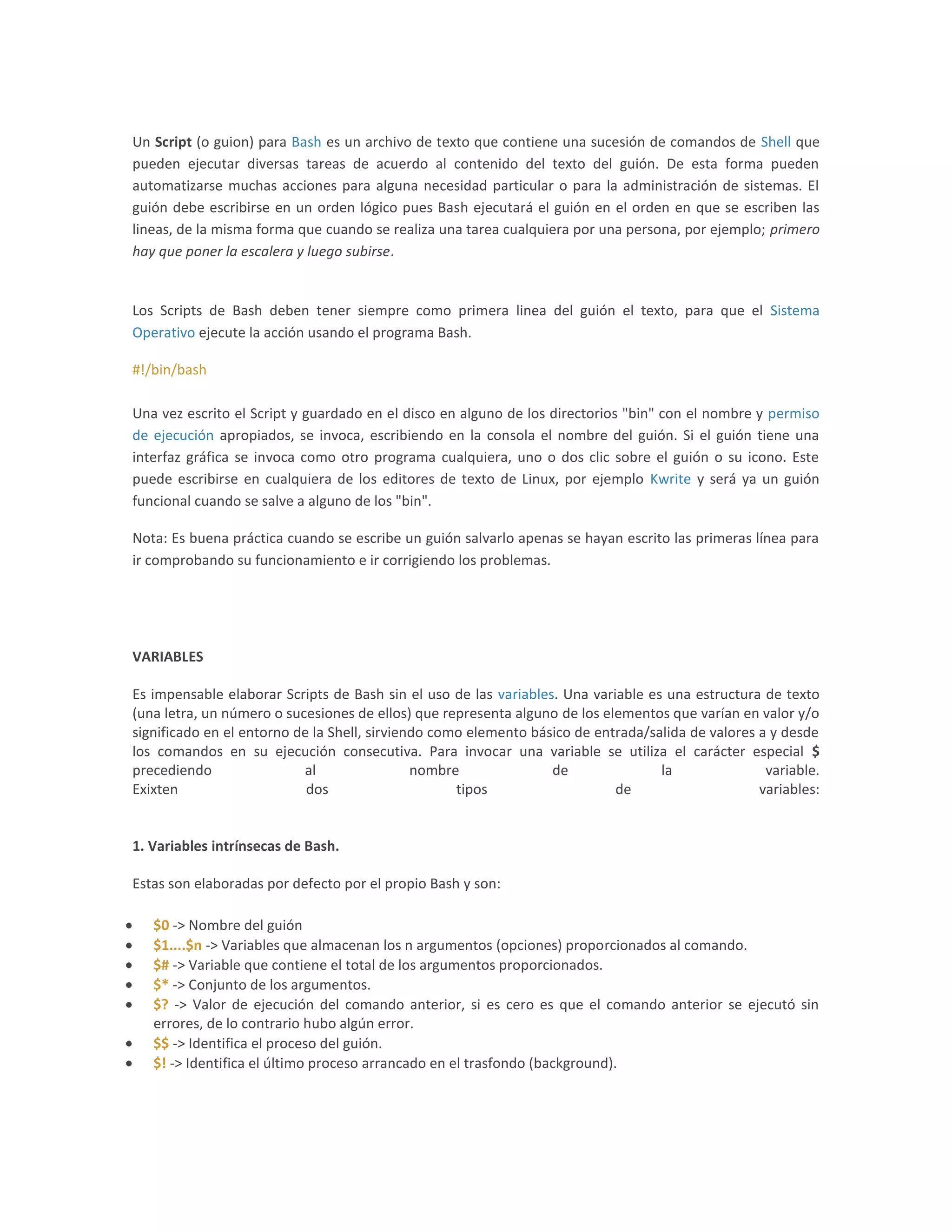El documento explica los scripts de Bash, incluyendo su estructura, variables, comandos condicionales y otros elementos clave. Los scripts automatizan tareas mediante la ejecución secuencial de líneas de comandos y pueden incluir variables, entrada/salida, condicionales if/then/else y case/in/esac.