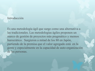 Scrum es una metodología ágil para gestionar proyectos que valora a las personas y su capacidad de autoorganización por encima de procesos y herramientas. Se basa en iteraciones cortas llamadas sprints de 2-4 semanas donde un equipo autónomo trabaja para crear un incremento de valor para el cliente. Incluye roles como Scrum Master, Product Owner y el equipo, así como rituales de planificación, revisión y retrospectiva diaria.