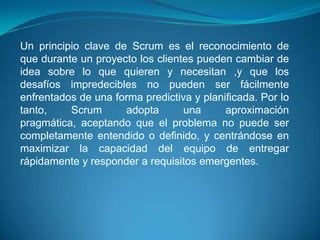 Scrum es una metodología ágil para el desarrollo de software basada en iteraciones cortas llamadas sprints para entregar valor al cliente de forma incremental. Define roles como Product Owner, Scrum Master y el equipo de desarrollo. Reconoce que los requisitos pueden cambiar y se enfoca en maximizar la capacidad del equipo para responder rápidamente.
