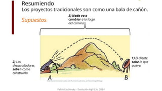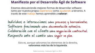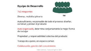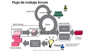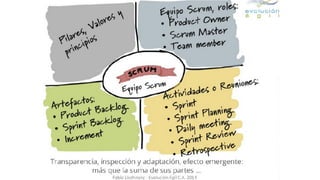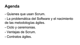 Este documento presenta Scrum, una metodología ágil para el desarrollo de software. Explica que Scrum se utiliza en grandes empresas como Nokia e Intel y no solo en proyectos pequeños. También describe los problemas comunes en el desarrollo de software tradicional como exceder el tiempo y el presupuesto. Luego resume las características clave de Scrum como su ciclo iterativo, ceremonias y ventajas como contratos flexibles. Finalmente, promueve la adopción de enfoques ágiles.