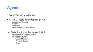 El taller de Scrum realizado en septiembre de 2017 en Cali, Colombia, cubrió fundamentos ágiles y el marco Scrum en varias sesiones, incluyendo roles, artefactos y eventos. Se discutieron los principios del Manifiesto Ágil, la historia de Scrum y su evolución como un marco de trabajo efectivo para el desarrollo de productos. Además, se abordaron prácticas de gestión de equipos Scrum y conceptos como la adaptación, inspección y transparencia, esenciales para implementar Scrum con éxito.