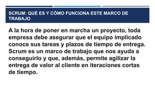 Scrum es un marco de trabajo ágil utilizado en proyectos de desarrollo de software que facilita la entrega rápida y eficiente de valor al cliente a través de iteraciones cortas llamadas sprints. Este enfoque fomenta la colaboración del equipo y sigue los principios del manifiesto ágil, enfocándose en valores como coraje, compromiso y transparencia. Aunque fácil de aprender, su implementación puede ser desafiante y requiere un cambio cultural dentro de la organización.