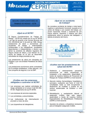 Este documento define los términos clave relacionados con el Seguro Complementario de Trabajo de Riesgo (SCTR) en Perú. El SCTR otorga prestaciones de salud y económicas a trabajadores que laboran en actividades de riesgo. Las empresas obligadas a contratar el SCTR incluyen aquellas que realizan actividades de riesgo, empresas de servicios especiales, contratistas, instituciones de intermediación laboral y cooperativas. El SCTR cubre accidentes de trabajo y enfermedades profesionales a través de prestaciones