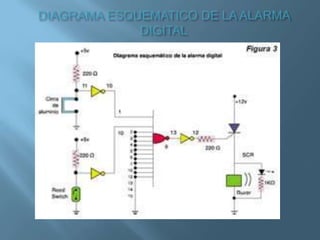 Este documento describe un proyecto de alarma digital con 13 elementos de seguridad controlados por circuitos digitales combinacionales. El objetivo es construir un circuito de alarma utilizando compuertas lógicas, interruptores magnéticos, un SCR y un buzzer. El circuito se construye en un protoboard y se activa cuando se rompe una tira de papel de aluminio en una ventana o se abre una puerta.