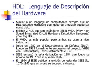 Este documento describe el lenguaje de descripción de hardware VHDL. Explica que VHDL permite describir circuitos digitales de una manera independiente de la tecnología para luego simularlos y fabricarlos. Describe las características principales de VHDL como su capacidad para trabajar de manera jerárquica y ser independiente de la implementación física. También explica la estructura básica de un programa VHDL que incluye la declaración de la entidad, la arquitectura y el uso de tipos de datos como BIT y BIT_
