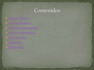 El documento describe los diferentes sensores y componentes de un robot, incluyendo sensores táctiles, acústicos, fotosensibles y ultrasónicos, así como servomotores, lámparas y Bluetooth. Explica brevemente la función de cada sensor y componente y cómo permiten que el robot se mueva, evite obstáculos, distinga sonidos y luminosidad, y se comunique inalámbricamente.