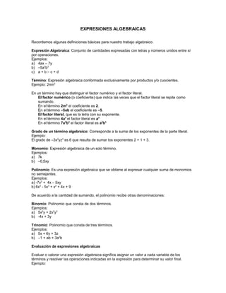 Este documento define conceptos básicos de álgebra como expresiones algebraicas, términos, monomios, polinomios, evaluación de expresiones, adición y multiplicación de términos. Explica la suma y diferencia de binomios, el cuadrado de un binomio, y la factorización de expresiones algebraicas. Proporciona ejemplos para ilustrar cada concepto.
