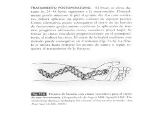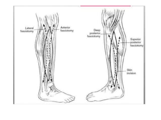 El síndrome compartimental se produce por un aumento de la presión dentro de un espacio fascial cerrado que reduce la perfusión de los tejidos. Se diagnostica mediante dolor al estiramiento de los músculos y palpación de tensión. El tratamiento es la fasciotomía quirúrgica para descomprimir los compartimentos afectados. Puede causar necrosis muscular y nerviosa, rabdomiolisis y otras complicaciones graves si no se trata a tiempo.