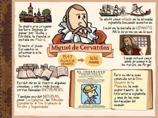 El Siglo de Oro en España abarcó los siglos XVI y XVII y se dividió en dos etapas: el Renacimiento y el Barroco. El Renacimiento trajo las ideas humanistas de exaltación de la naturaleza y del hombre. Autores prominentes incluyeron a Cervantes, Garcilaso de la Vega y Fray Luis de León. El Barroco se caracterizó por el pesimismo y el desengaño, con autores como Góngora, Quevedo, Lope de Vega y Calderón de la Barca. Esta fue la edad de oro