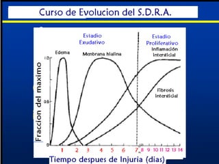 El documento describe el Síndrome de Distress Respiratorio del Adulto (SDRA), incluyendo su definición, factores de riesgo, patogénesis, manifestaciones clínicas, evaluación, tratamiento y pronóstico. El SDRA se caracteriza por disnea severa, baja relación PaO2/FiO2, infiltrados pulmonares bilaterales y baja complacencia pulmonar, y puede ser causado por condiciones como aspiración, trauma o sepsis. El tratamiento se enfoca en soporte ventilatorio y prevención de complic