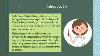 El documento describe el Síndrome de Distress Respiratorio en recién nacidos. Este síndrome se produce principalmente por falta de surfactante y causa dificultad respiratoria en bebés prematuros. Los signos incluyen taquipnea, cianosis y quejidos respiratorios. El diagnóstico se realiza mediante examen físico y radiografía de tórax. El tratamiento involucra oxígeno suplementario, CPAP y administración de surfactante artificial.