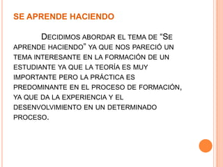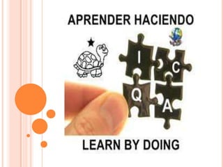 El documento discute cómo el aprendizaje práctico es más efectivo que solo la teoría. Da ejemplos de cómo guiar a los niños en procesos prácticos como cocinar o hacer un jarro les permite aprender de manera más duradera que solo leer o estudiar. Otro ejemplo es aprender a conducir, donde la práctica permite improvisar y desarrollar experiencia.