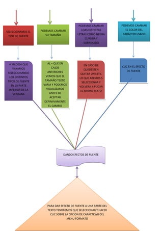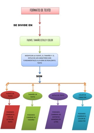 El documento describe los diferentes formatos de texto que pueden modificarse, incluyendo la fuente, tamaño, estilo y color. Se pueden cambiar la fuente, tamaño y estilo de los caracteres, así como aplicar efectos como negrilla, cursiva y subrayado. También se pueden seleccionar caracteres en superíndice o subíndice.