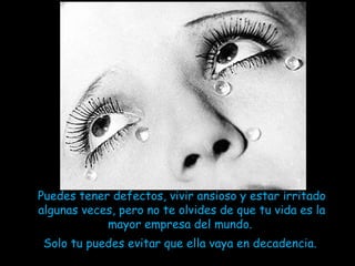El documento ofrece consejos sobre cómo ser feliz a pesar de los desafíos de la vida. Sugiera que la felicidad no significa una vida sin problemas, sino tener la fuerza para perdonar, la esperanza para luchar, y el amor incluso cuando las cosas no salen como se planea. También enfatiza la importancia de apreciar tanto las sonrisas como las lágrimas, y de aprender de los fracasos tanto como de los éxitos. En resumen, propone que la felicidad se trata de vivir la vida plenamente a pesar de todas las dific
