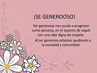 Este documento enfatiza la importancia de la generosidad y cómo ayuda a las personas y a la sociedad. Ser generoso significa ayudar a los demás sin esperar nada a cambio, escuchar a los amigos, ofrecer pequeños actos de servicio como llevar agua o dejar que los demás tomen decisiones. La generosidad mejora las relaciones interpersonales y crea una sociedad más unida.