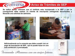 El documento describe los pasos para registrar a estudiantes nuevos en la Secretaría de Educación Pública (SEP), incluyendo la recolección de documentos, llenado de solicitudes, captura de datos, y entrega de documentación a las juntas de gerentes y control escolar.