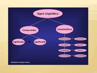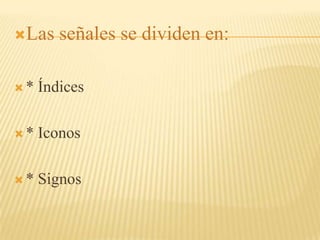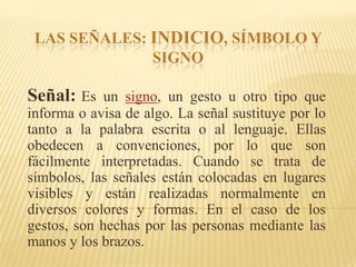 Este documento describe diferentes tipos de señales como indicios, iconos y signos. Explica que las señales sustituyen al lenguaje y obedecen a convenciones para ser fácilmente interpretadas. Se dividen en índices, iconos y signos. Los indicios proporcionan información sobre algo que ha ocurrido o va a ocurrir. Los iconos son imágenes como mapas. Los signos representan conceptos de forma perceptible y pueden ser comprendidos. Finalmente, se describe el signo lingüístico como la combinación de un signific