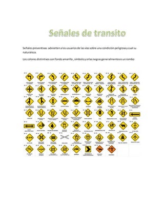 Este documento resume los diferentes tipos de señales de tránsito, incluyendo señales preventivas con fondo amarillo que advierten sobre condiciones peligrosas, señales reglamentarias con fondo blanco que indican restricciones, señales informativas con fondo azul que proveen información a los conductores, y señales de piso como líneas amarillas o blancas en la calzada.