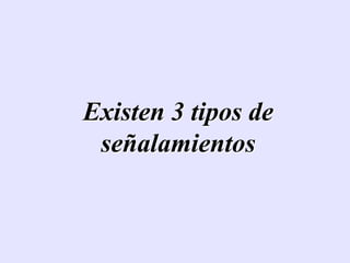 Existen tres tipos principales de señales de tránsito: informativas, de recomendación y preventivas o de advertencia. Las señales informativas proveen información sobre destinos y servicios, las de recomendación dan consejos de seguridad y las preventivas advierten sobre peligros en la carretera usando símbolos de color amarillo. Conocer y obedecer las señales de tránsito es importante para la seguridad vial y la convivencia entre los conductores.