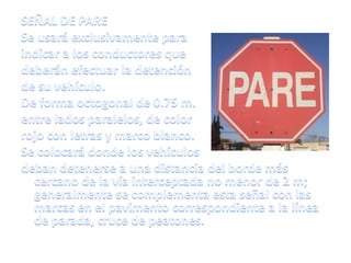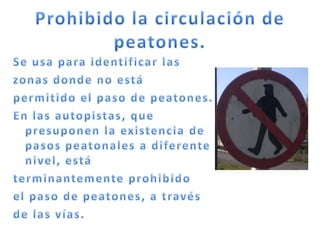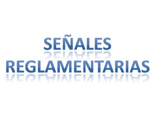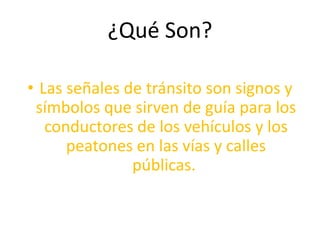 Las señales de tránsito guían a conductores y peatones y se dividen en verticales, horizontales, luminosas, transitorias, manuales y sonoras. Las verticales incluyen señales de reglamentación como límites de velocidad, estacionamiento y prohibiciones; y de prevención como zonas peatonales, cebras y curvas. Las señales comunican reglas y advierten de condiciones del camino.