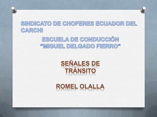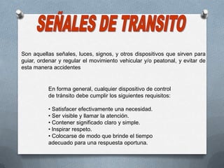 Este documento clasifica y describe los diferentes tipos de señales de tránsito, incluyendo señales manuales, luminosas, acústicas, verticales y horizontales. Explica que las señales deben cumplir con requisitos como ser visibles y llamar la atención, tener un significado claro y simple, e inspirar respeto. Además, clasifica las señales verticales en regulatorias, preventivas, informativas y de riesgo.