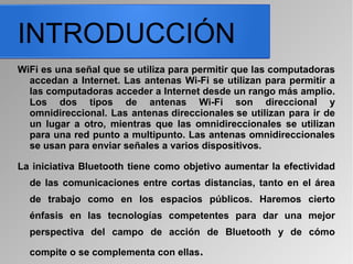 El documento aborda las tecnologías Wi-Fi y Bluetooth, explicando sus funciones, características, tipos de antenas y dispositivos relacionados. Se destaca el uso de Wi-Fi para acceder a Internet con diferentes tipos de antenas, y el papel de Bluetooth para conexiones de corto alcance entre dispositivos. También se detallan sus ventajas y desventajas, así como las bandas de frecuencia que utilizan.