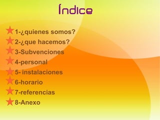 Este documento describe una organización dedicada a ayudar a las personas mayores. La organización ofrece actividades de ocio y entretenimiento para mejorar la calidad de vida de los ancianos. Cuenta con voluntarios, personal cualificado, médicos y enfermeras las 24 horas. También dispone de una residencia con 40 habitaciones y otras instalaciones como piscina y gimnasio.