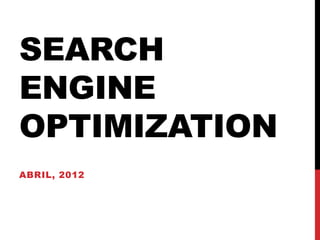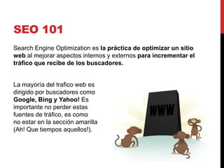 Este documento ofrece una introducción al concepto de optimización para motores de búsqueda (SEO) y explica cómo funcionan los principales motores de búsqueda como Google, Bing y Yahoo. Describe el proceso de rastreo y indexación de páginas web, los factores que determinan el ranking de resultados y ofrece consejos prácticos sobre el desarrollo de contenido, el uso de palabras clave y herramientas de medición para mejorar el posicionamiento orgánico en los buscadores.