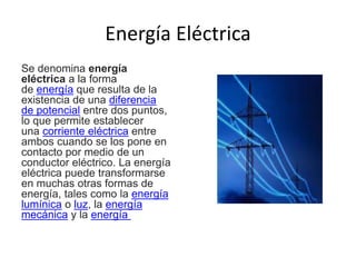 Este documento presenta definiciones breves de diferentes tipos de energía, incluyendo energía eléctrica, lumínica, mecánica, térmica, eólica, solar, nuclear, cinética, potencial, química, hidráulica, sonora, radiante, fotovoltaica, de activación, iónica, geotérmica y mareomotriz. Cada tipo de energía se describe en una o dos oraciones resumiendo su fuente y cómo puede transformarse o usarse.