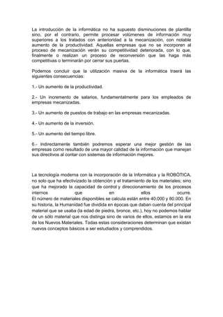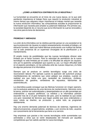 Este documento describe cómo la robótica y la automatización industrial están transformando el trabajo y la producción. Por un lado, permiten que las fábricas funcionen con poca o ninguna presencia humana directa, pero por otro lado generan nuevas demandas de trabajadores calificados en áreas como la ingeniería, programación y mantenimiento de sistemas. Aunque algunos empleos desaparecen, surgen nuevas oportunidades laborales en empresas que adoptan las nuevas tecnologías. En general, se espera que la automatización aumente la productividad