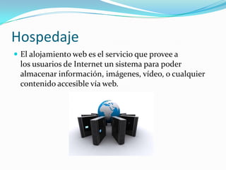 Este documento resume conceptos clave relacionados con Internet y la web. Define términos como alojamiento web, dominio web, URL, proxy, protocolo, hipertexto, alojamiento en la nube, software como servicio, RSS, posicionamiento web, HTTPS, cibernauta, leecher, encriptación y netiquette.
