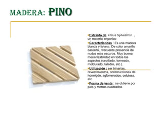 El documento describe las características, usos y formas de venta de varios materiales como la madera, metales, plásticos, pétreos, cerámica, vidrio, textiles y más. La madera de pino se utiliza para serrarías y revestimientos, mientras que la madera de roble es valiosa para barriles de vino y muebles. El cobre se extrae de minas y se usa en cables eléctricos, y el latón es una aleación de cobre y zinc usada en soldadura y joyería. El PVC y