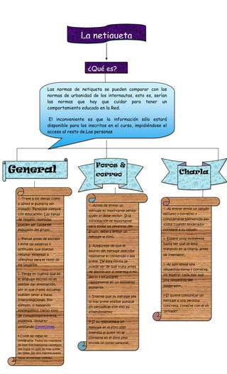Este documento proporciona instrucciones sobre cómo participar adecuadamente en foros de discusión en línea. Recomienda enviar saludos corteses al entrar y salir, esperar a comprender el tema antes de intervenir, usar mensajes privados para comunicarse individualmente, evitar mensajes excesivamente largos o repetitivos, y asegurarse de que los mensajes sean breves y pertinentes al tema. También enfatiza tratar a los demás con respeto, pensar antes de escribir para evitar ofensas, y cuidar la ortografía.
