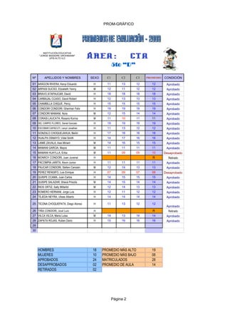 Este documento presenta los resultados académicos del 5to grado de la sección "D" de la Institución Educativa "Jorge Basadre Grohmann" en el año 2009. Contiene la lista de 28 estudiantes con sus calificaciones en 3 asignaturas (C1, C2 y C3) y promedio. De los 28 estudiantes, 24 fueron aprobados y 2 desaprobaron. El promedio más alto fue 19 y el más bajo fue 8. 18 estudiantes eran hombres y 10 mujeres.
